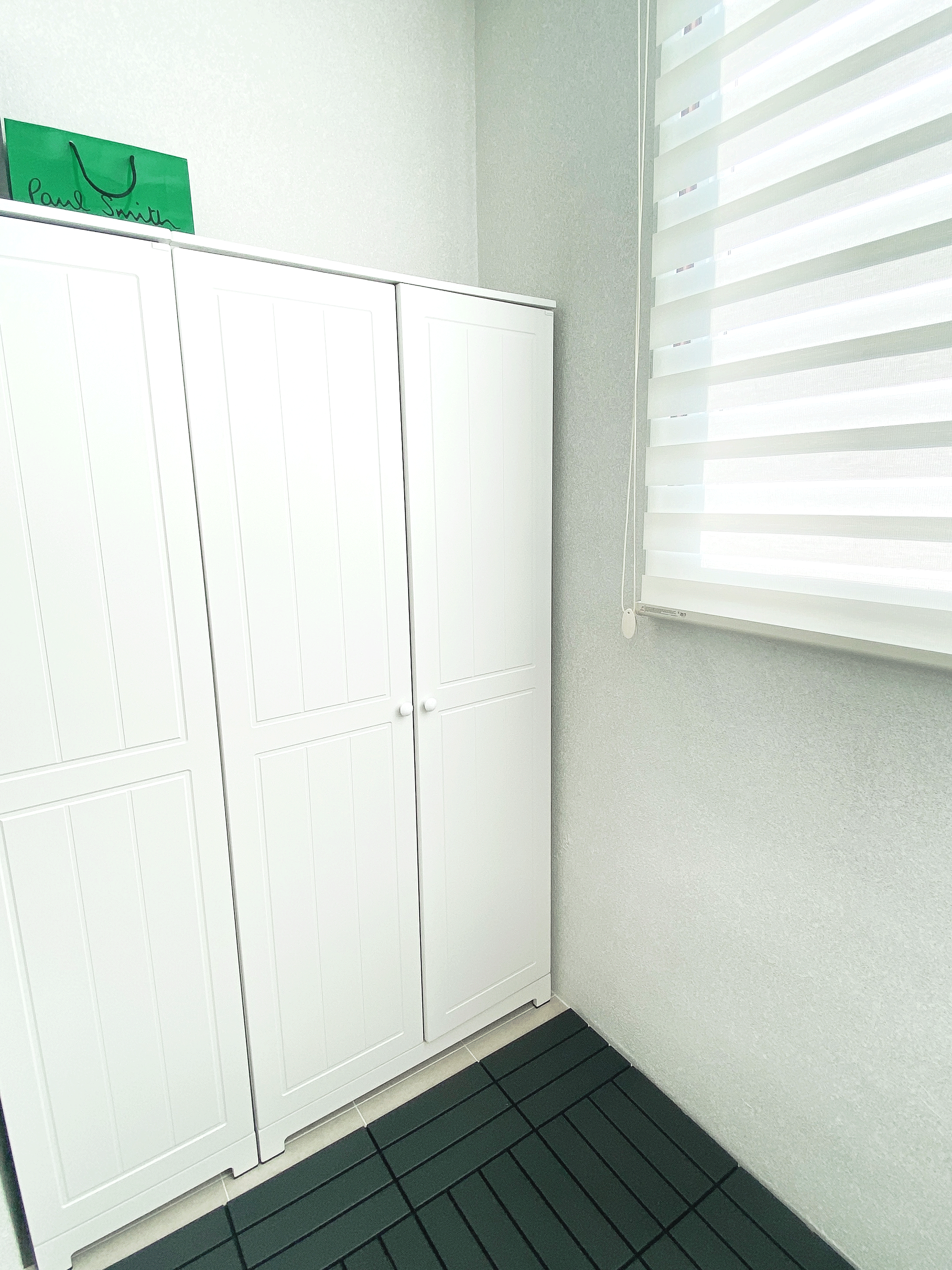 이렇게 베란타 타일이 차가우니, 우드블럭이라고 하나요? 데코타일을 바닥사이즈에 맞게 깔고, 신발장 가구사이즈를 미리재어 알맞는 사이즈의 신발장을 구입하여 배치하였어요. 옆에 옷걸이는 잘안입는 옷이나, 여름옷을 빼놓았구요.