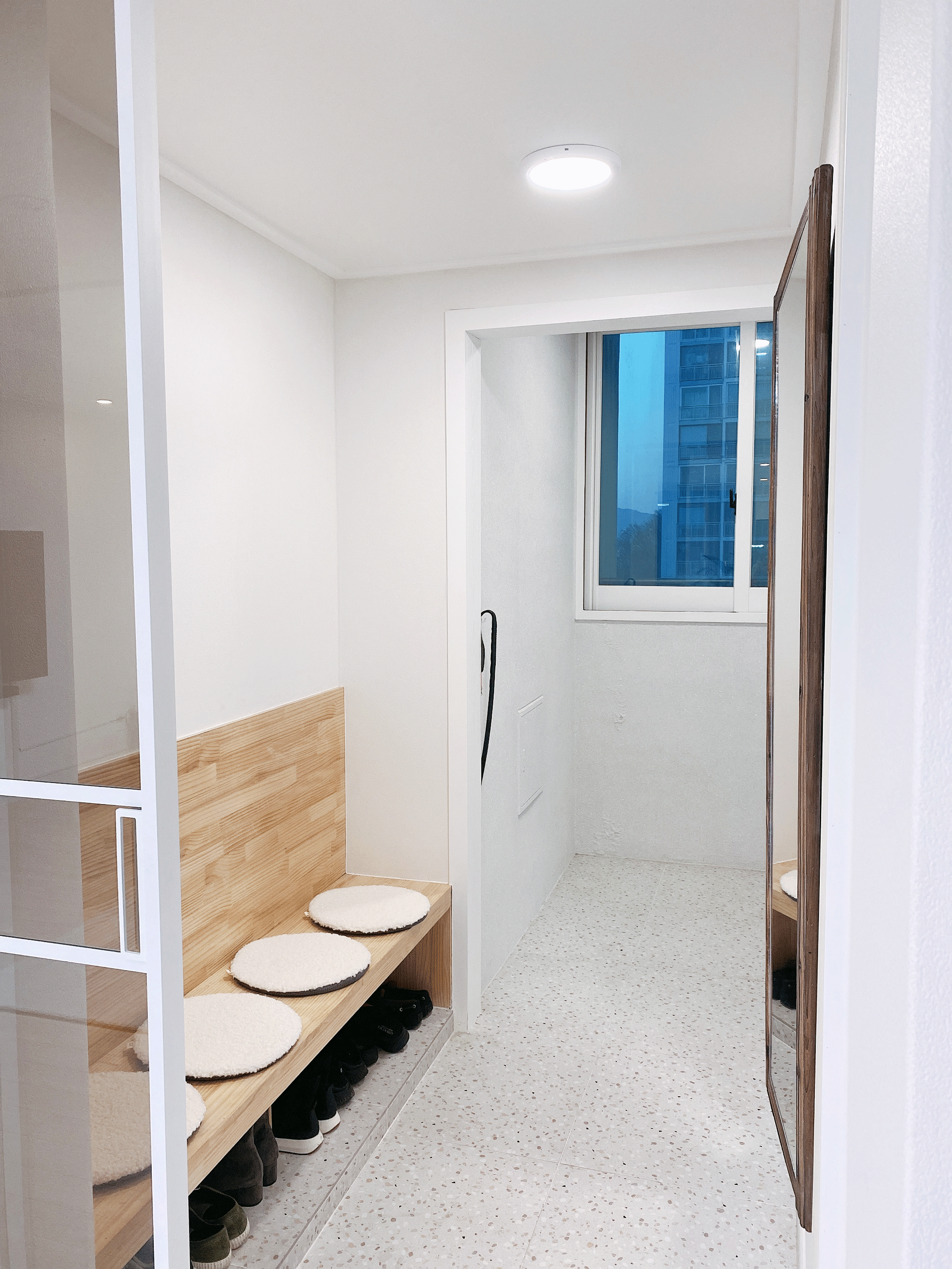 저희는 앉아서 신발도 신을수 있는 벤치 타입으로 시공을 요청드렸어요. 그리고 벤치가 끝나는 부분에 복도식 통로를 만들어 깔끔하게 마감하여 기존에 있던 철문으로 되어있던 현관을 제거하고 거실앞부분에 화이트프레임의 중문을 설치하여 현관 공간을 보다 더 넓게 시공하였답니다.